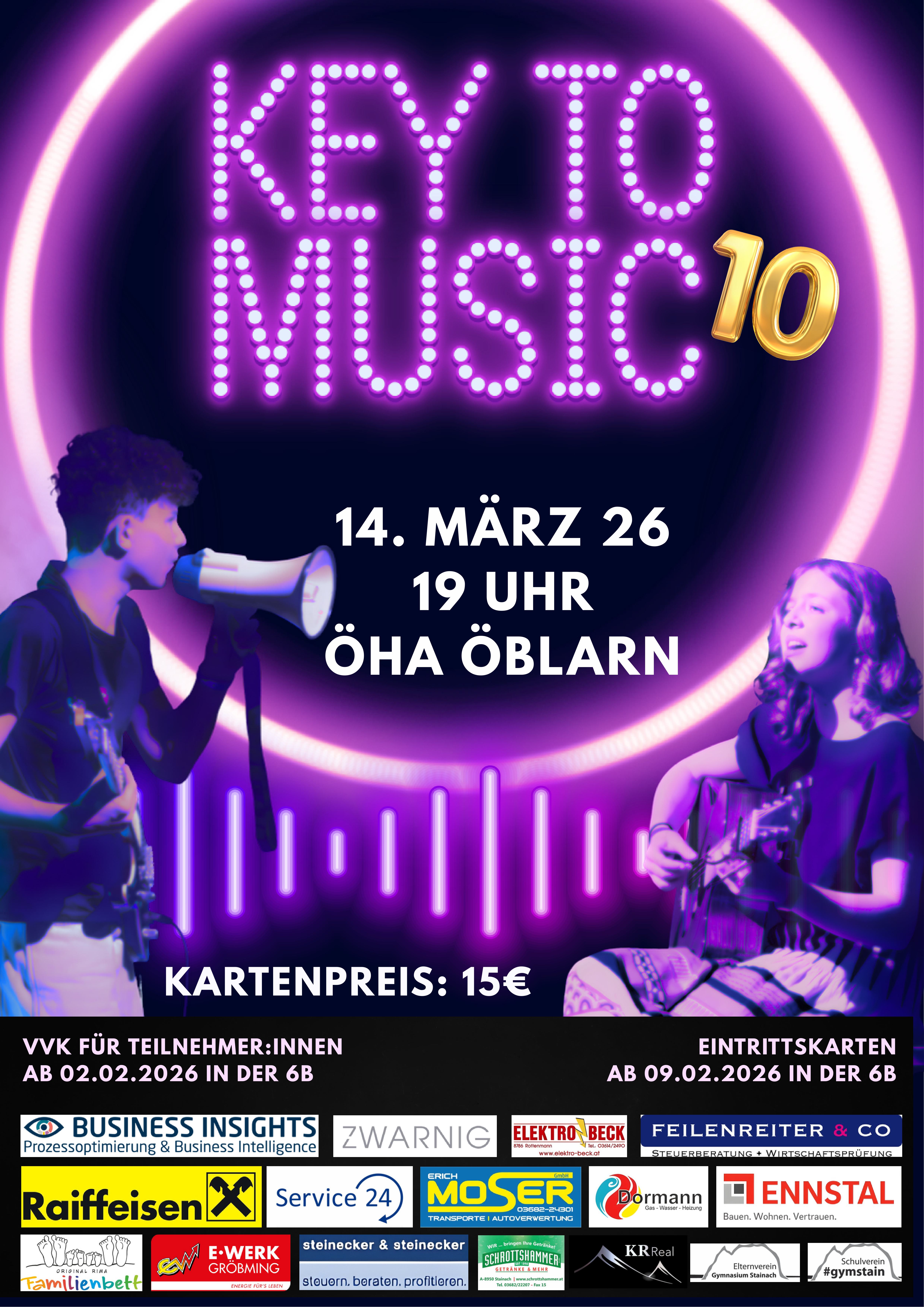 Am 14. März 2026 ist es wieder so weit: Das BG/BRG Stainach lädt zur 10. Ausgabe von Key to Music – dem musikalischen Highlight des Schuljahres! Im stimmungsvollen Ambiente des ÖHA Öblarn erwartet euch ein Abend voller Emotionen, mitreißender Performances und Gänsehautmomenten, die unter die Haut gehen.
