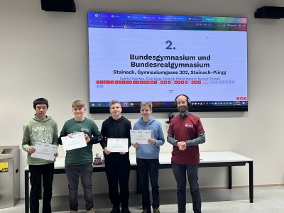 Am vergangenen Freitag, dem 21.11., fand als erster Mathematik-Wettbewerb in diesem Schuljahr der Náboj Junior Wettbewerb in Graz statt. Dabei handelt es sich um einen Mathematik-Team-Wettbewerb für Schülerinnen und Schüler der 4. und 5. Klassen. Zum ersten Mal nahm daran ein Team unserer Schule aus dem Mathematik-Olympiade-Kurs teil – und das mit einem wirklich tollen Ergebnis! Das Team aus Gabriel Deschka (5b), Elias Egger (5a), Dominik Pfatschbacher (5b) und Manuel Schwab (5b) belegte in der Steiermark den 2. Platz von 27 Teams und liegt österreichweit auf Platz 3.